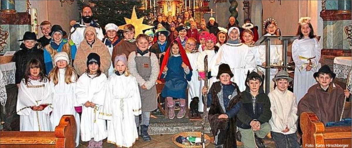 Klassisch begann das Krippenspiel mit dem Boten des Kaisers Augustus, der zur Steuerzählung aufruft. Auch Maria und Josef machen sich auf den Weg, die Geschichte hat viele regionale Züge aus der Pfarrgemeinde bekommen. Die bayerisch sprechenden Wirte haben keinen Platz, bis einer schließlich seinen Schuppen anbietet. Dort wird Jesus geboren und zum Weihnachtsstern gesellen sich viele Sterne mit besonderen Aufgaben, so bringen sie Trost, Hoffnung, Freude oder Frieden.
