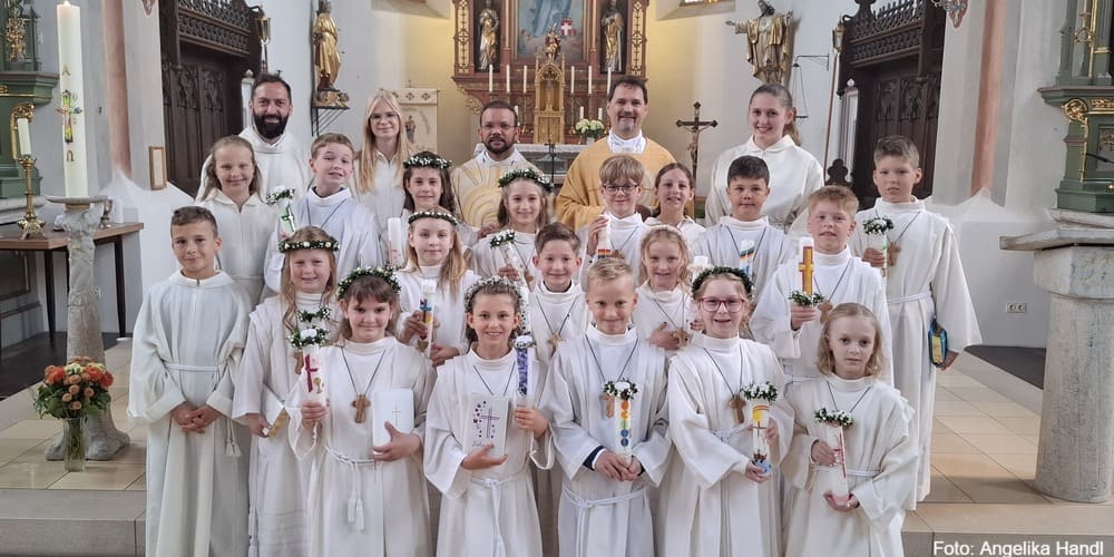 Bei der Gestaltung der Messe, waren die Erstkommunionkinder mit eingebunden, indem sie die Fürbitten vortrugen und bei der Gabenbereitung mithelfen durften. Nach dem gemeinsamen Vater Unser, bei dem die jungen Gläubigen einen Kreis um den Altar bildeten, konnten sie sodann, zum ersten Mal den Leib Christi aus den Händen des Dekans, empfangen. Neben den Eltern, Verwandten und Freunden kam auch die Rektorin der Zeller Schule, Elisabeth Bacs – die die Orgel spielte, sowie Klassenlehrerin Andrea Seebauer, die eine der Lesungen vorbrachte, zum großen Tag der Schüler. Dekan Heidenreich wünschte abschließend, dass sich die Kinder auch weiterhin mit ihren Eltern in der Pfarreiengemeinschaft einbringen. Zum Abschlusslied „Großer Gott, wir loben Dich“ zogen die Kommunionkinder feierlich aus der Kirche.