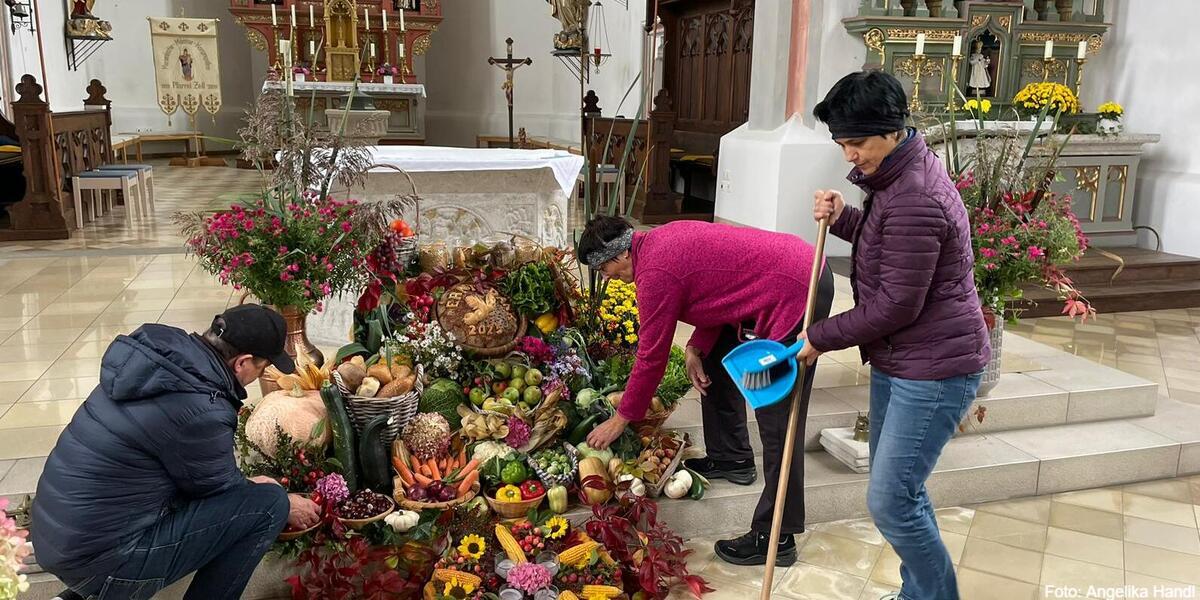 Viele Hände - schnelles Ende. Die Gartler des OGV Zell bewahren mit dem Herrichten des Erntealtars in Zell eine schöne und wichtige Tradition.